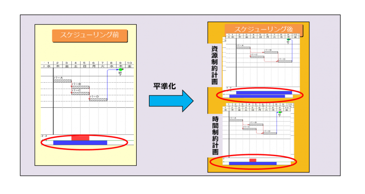 資源・時間のどちらか一方に着目して、平準化を行うことができる