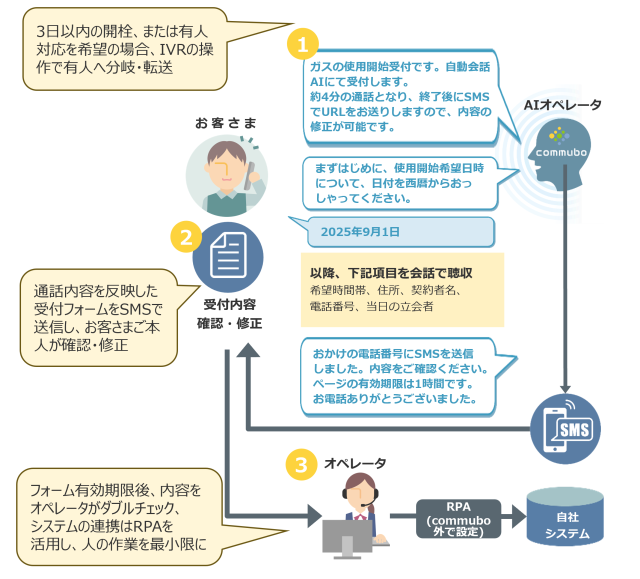 同社は中期計画の目標を3年以内に達成するため、スピード感を重視。複数ベンダーを比較した結果、commuboは「BIZTEL連携」「シナリオの自社構築」「低コスト・高性能」「導入期間の短さ」「サポート体制」「音声認識精度」などの点で評価された。 今回は、ガスの使用開始受付のような会話ラリーの多い業務を対象にスモールスタートを実施し、RPAとも連動させることで後工程の効率化も実現。発話の簡略化やセルフエディットページ活用などの工夫により、お客さまの負担を減らしながらスムーズな受付を可能にした。